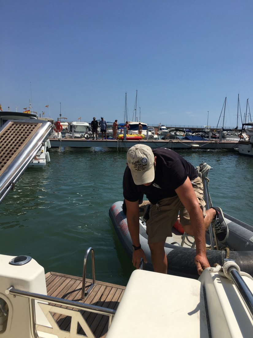 Quan passades les dues ha arribat el busso que havia de ser qui ens alliberés del problema, resulta que el pobre tenia una tendinitis i no li era possible baixar. En fi que allà al mig hem anat donant conversa als uns i altres fins que l’entrada a port d’altres vaixells i el perill que provocàvem ha estat decisiu per prendre una mesura, arraconar el barco, pujar a una barca pneumàtica i desembarcar a port. Els nens ho vivien amb intensitat però guardant els nervis per altres ocasions.