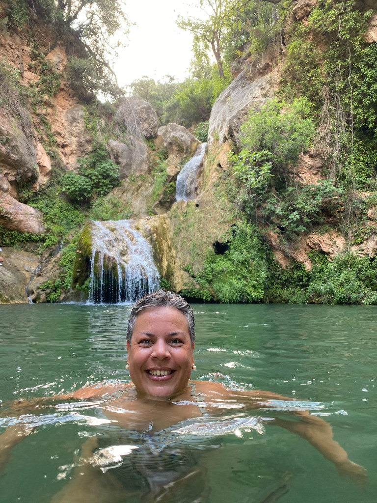 Uns crits, unes rialles, un soroll d’aigua caient ens han posat sobre l’avís. Ja havíem arribat al Niu de l’Àliga. Ens hi esperava un gorg profund i amb un salt d’aigua que feia les delícies de tots els visitants que s’hi aplegaven. Mai de la vida hagués pensat en banyar-me en unes aigües tant gèlides però necessitava refrescar-me de valent. M’he calçat les sabates d’aigua. M’he tret la samarreta que ja era xopa i cap dins. Una exclamació blasfèmica ha estat la meva benvinguda, però he nedat, m’he capbussat fins que els braços i les mans em feien mal de freda com estava l’aigua. Una mica més serena he copsat la màgia de l’indret i he assaborit l’estona i la fresca mirant els nens i en Xavi. Estava segura que els havia agradat la proposta i que haver-nos tret la mandra havia estat una bona pensada. L’estiu està per descobrir el què t’envolta i l’Alcover i el Niu de l’àliga han estat una descoberta majúscula a només mitja horeta en cotxe de Cambrils.