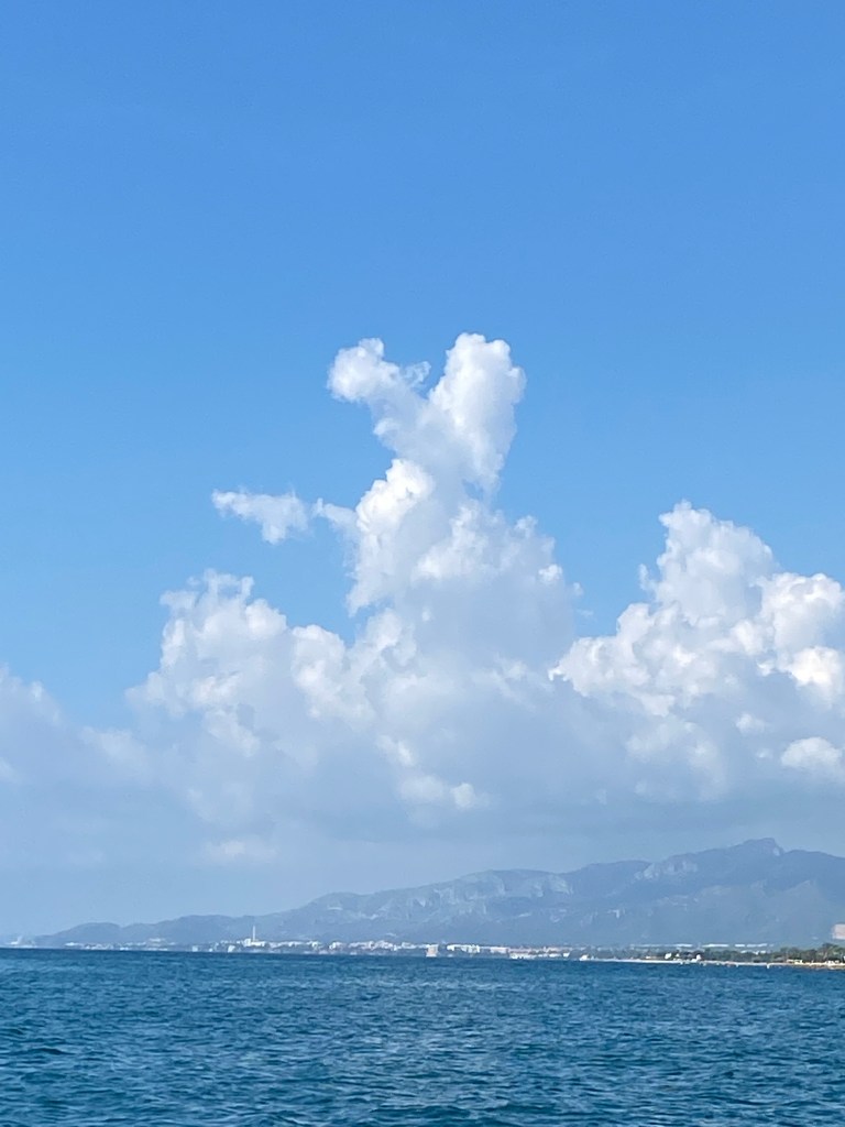 Superada la sorpresa climatològica hem anat a banyar-nos amb l’Epsylon, la barca de l’avi. Uns núvols que amenaçaven en descarregar la pluja que portaven al ventre s’han convertit en un divertiment mentre miràvem el cel de reüll. Imaginàvem gossos, escorpins, superherois, parts del cos i gaudíem de la creativitat que emergeix amb més força quan s’expressa a través del joc. La mar marejava així que al cap de poc i remullats hem tornat a port.